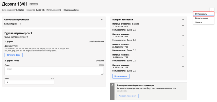 10. После того, как все необходимые параметры в матрице указаны, нажмите кнопку Опубликовать.