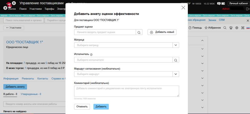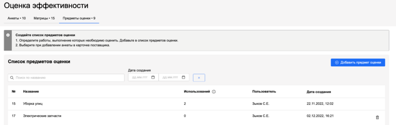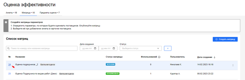 Для автоматизации процесса оценки поставщиков в Системе имеется возможность создать Матрицу оценки эффективности.