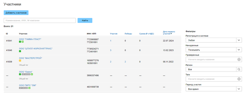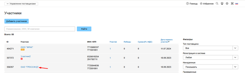 2.На главной странице раздела Управление поставщиками нажмите на ссылку с количеством участников.