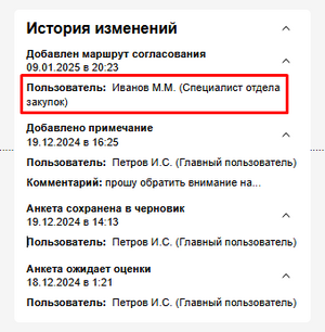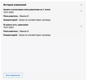При наличии замечаний Согласующий может вернуть анкету на доработку (в этом случае анкета получит статус Замечания). Внесите исправления в анкете согласно комментарию Согласующего, который отображается в блоке История изменений: