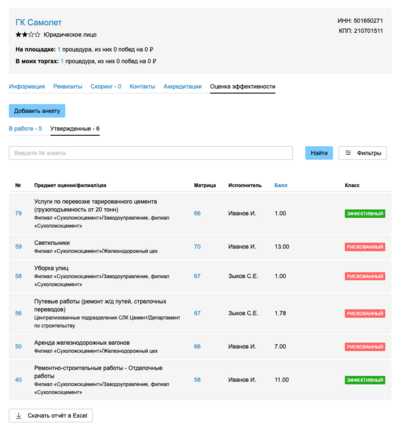 Чтобы сформировать отчет по оценке эффективности определённого поставщика по всем анкетам, выполните следующие действия: