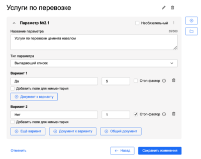 если требуется, чтобы исполнитель приложил документ к критерию, нажмите +Документ к варианту. Укажите название документа. При необходимости установите отметки в полях Необязательный (если предоставление документов необязательный критерий) и Требуется указать срок действия документа;