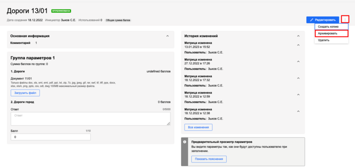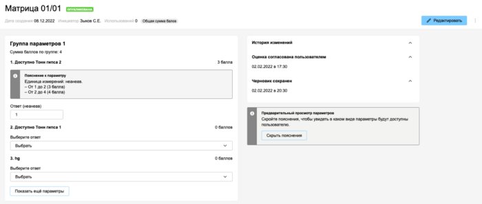 Матрица оценки – это шаблон с набором параметров (в Системе они именуются «группами параметров»), которые затем будут использоваться в той или иной анкете для оценки эффективности поставщика.