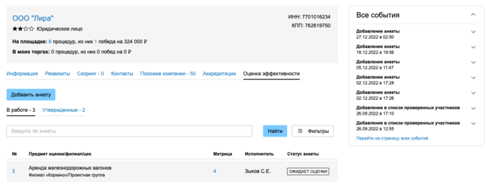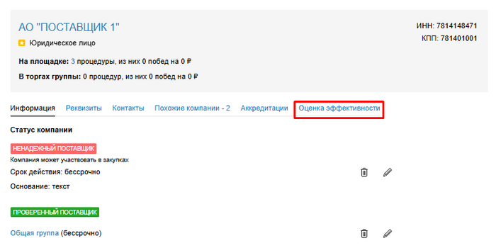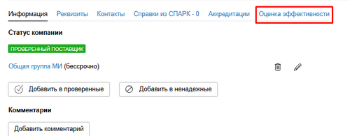 4. Откроется карточка поставщика. Перейдите на вкладку Оценка эффективности.