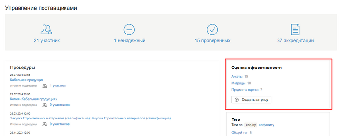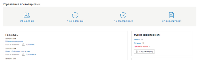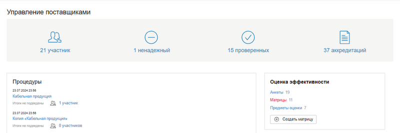 2. Откроется главная страница раздела Управление поставщиками. В блоке Оценка эффективности нажмите на кнопку +Создать матрицу.