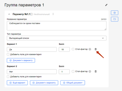 если вариант предупреждает о существенных рисках в работе с поставщиком установите отметку у поля Стоп-фактор;