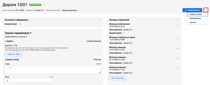 6. Внесите необходимые изменения параметров матрицы в статусе Параметры оценки и нажмите кнопку Сохранить изменения.