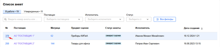 2.1.3. Откроется список всех анкет для оценки выбранного поставщика. Нажмите на ссылку с номером анкеты, в которой необходимо оставить примечание.