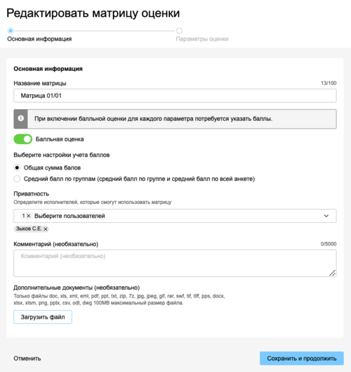 5. Внесите необходимые изменения данных матрицы в статусе Основная информация и нажмите кнопку Сохранить и продолжить.