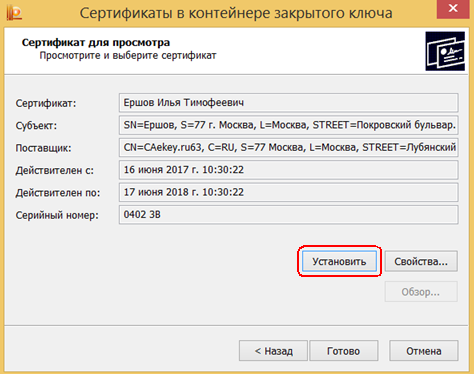 Убедитесь в правильности выбранного для установки сертификата, нажмите кнопку Установить и, если потребуется, подтвердите замену сертификата.