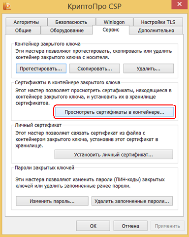 Подключите к компьютеру носитель полученного вами в удостоверяющем центре ключевого контейнера (Rutoken или другой USB-ключ). Откройте приложение Пуск > Панель управления > КриптоПро CSP, перейдите на вкладку Сервис и нажмите кнопку Просмотреть сертификаты в контейнере.
