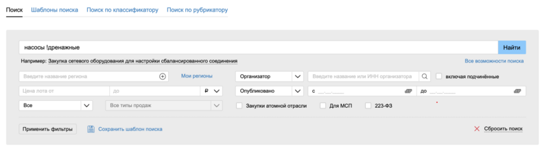 - 223-ФЗ — поиск только тех процедур, которые проводятся в соответствии с требованиями федерального закона №223 «О закупках товаров, работ, услуг отдельными видами юридических лиц».