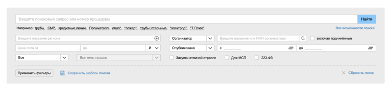 - МСП — поиск только тех процедур, для участия в которых требуется подтверждение статуса МСП у Оператора Системы.