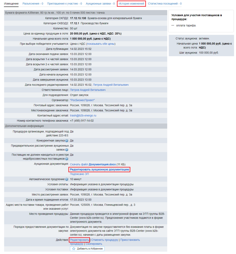 Изменения в опубликованном аукционе, находящемся в статусе активен, сохраняются после подписания ЭП и отображаются на странице История изменений.