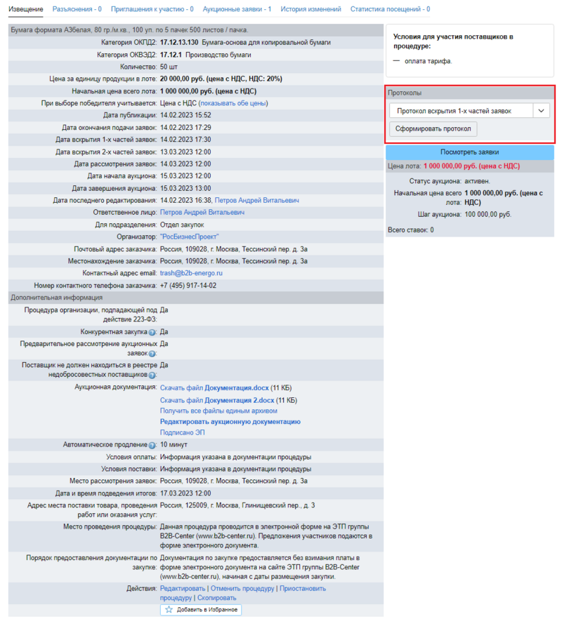 Вы также получаете доступ к составлению протокола вскрытия конвертов с аукционными заявками и рассмотрению этих заявок.