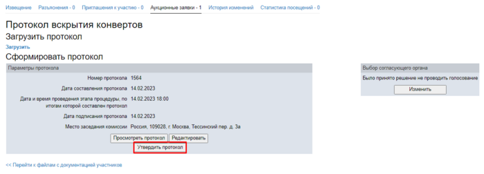 и подтвердите действие. Отобразится уведомление Протокол утвержден!