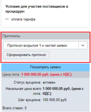 1. Чтобы составить и утвердить протокол вскрытия 1-х частей заявок, перейдите на страницу и в блоке Протоколы выберите в выпадающем списке вариант Протокол вскрытия 1-х частей заявок, после чего нажмите кнопку Сформировать протокол.