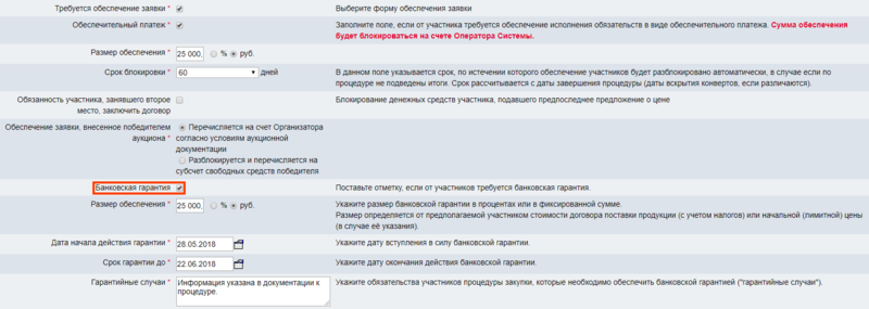 Если по условиям процедуры от участников требуется Банковская гарантия, поставьте отметку в соответствующее поле и заполните появившиеся дополнительные поля.