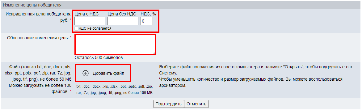 3. При наличии обоснований вы можете Изменить цену победителя или Изменить цену резервных победителей с помощью соответствующих ссылок.