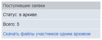1. Чтобы скачать документацию участников по всем лотам одним архивом, нажмите ссылку Скачать файлы участников одним архивом в блоке Поступившие заявки страницы Извещение.