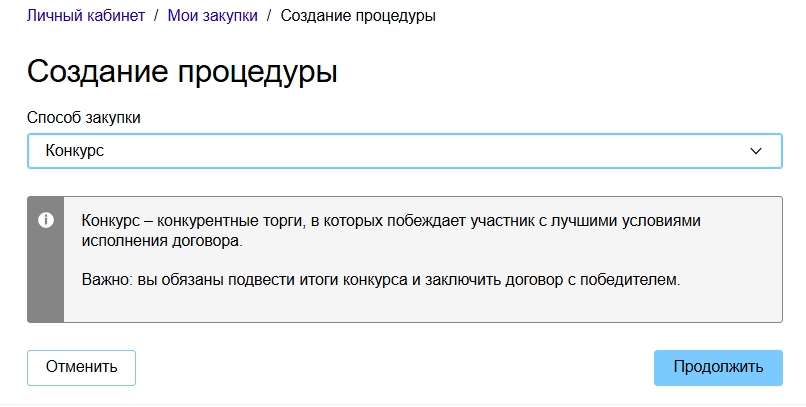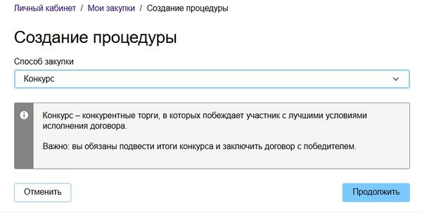 3. В выпадающем списке Способ закупки выберите вариант Конкурс и нажмите кнопку Продолжить.