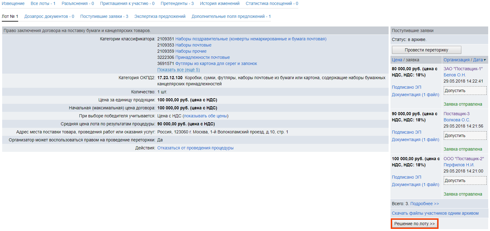 После проведения вскрытия и рассмотрения заявок, переторжки и дозапросов документов необходимо вынести решение по лотам и подвести итоги конкурса.