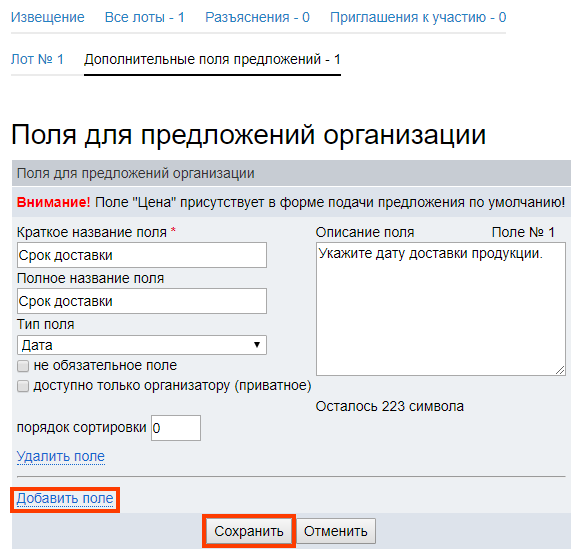 Внимание! При создании лота необходимо добавить как минимум 1 дополнительное поле предложений.