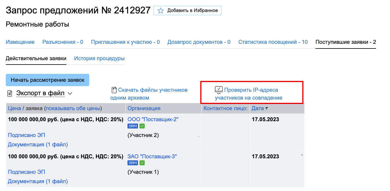 После того как поступило более двух заявок, в Системе имеется возможность проверки IP-адресов участников на совпадение.
