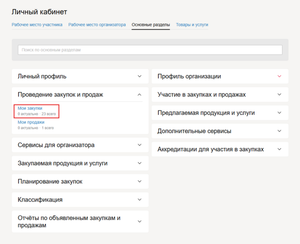 1. Для подготовки извещения перейдите в Личный кабинет, раскройте раздел Проведение закупок и продаж и нажмите ссылку Мои закупки.
