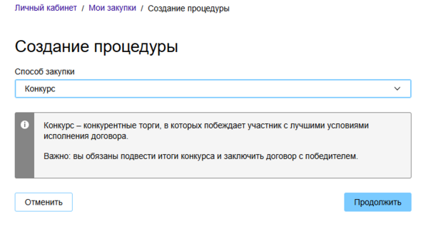 2.1. Отобразится страница Создание процедуры. В выпадающем списке Способ закупки выберите вариант Конкурс и нажмите кнопку Продолжить.