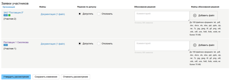 5. Произведите допуск/отклонение участников с помощью отметок Допустить и Отклонить. При необходимости напишите комментарии в текстовых полях и загрузите Дополнительные файлы с помощью кнопок + Добавить файл.