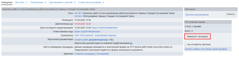 1. После утверждения протокола вскрытия конвертов перейдите на страницу лота и откройте вкладку Поступившие заявки, или нажмите кнопку Посмотреть заявки в правой части страницы.
