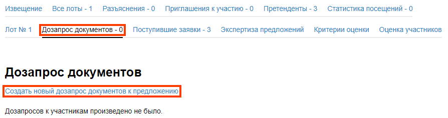 1. Находясь на странице лота, откройте вкладку Дозапрос документов и нажмите ссылку Создать новый дозапрос документов к предложению.