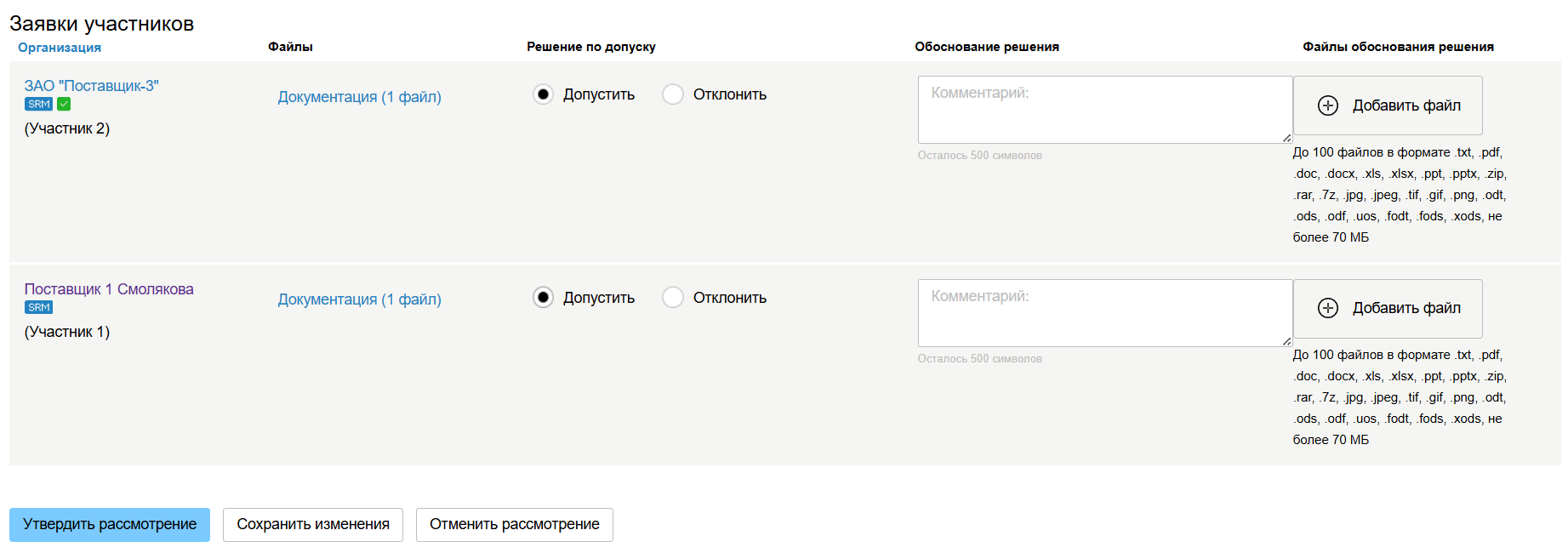 3. Произведите допуск/отклонение участников с помощью отметок Допустить и Отклонить. При необходимости напишите комментарии в текстовых полях и загрузите Дополнительные файлы с помощью кнопок + Добавить файл.
