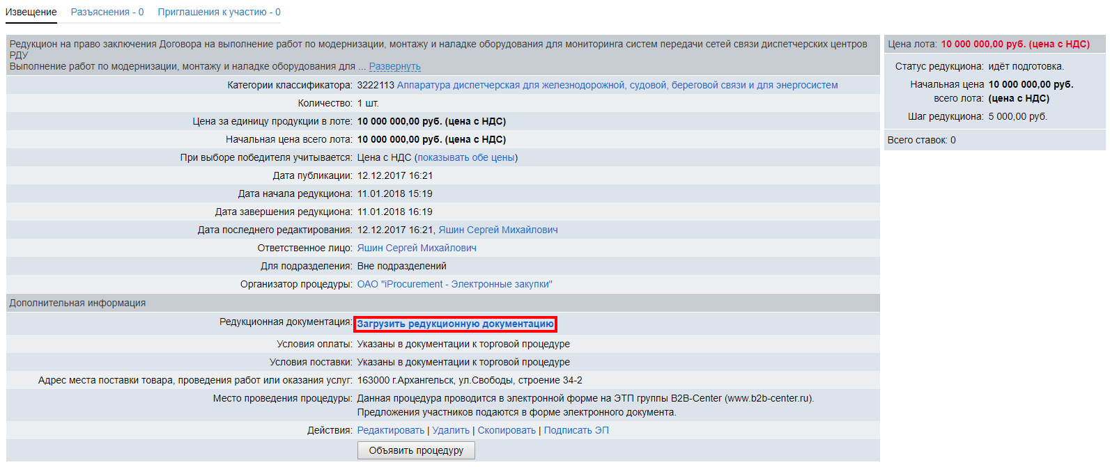 . На обновленной странице появится уведомление Процедура успешно объявлена. Статус редукциона изменится на активен.