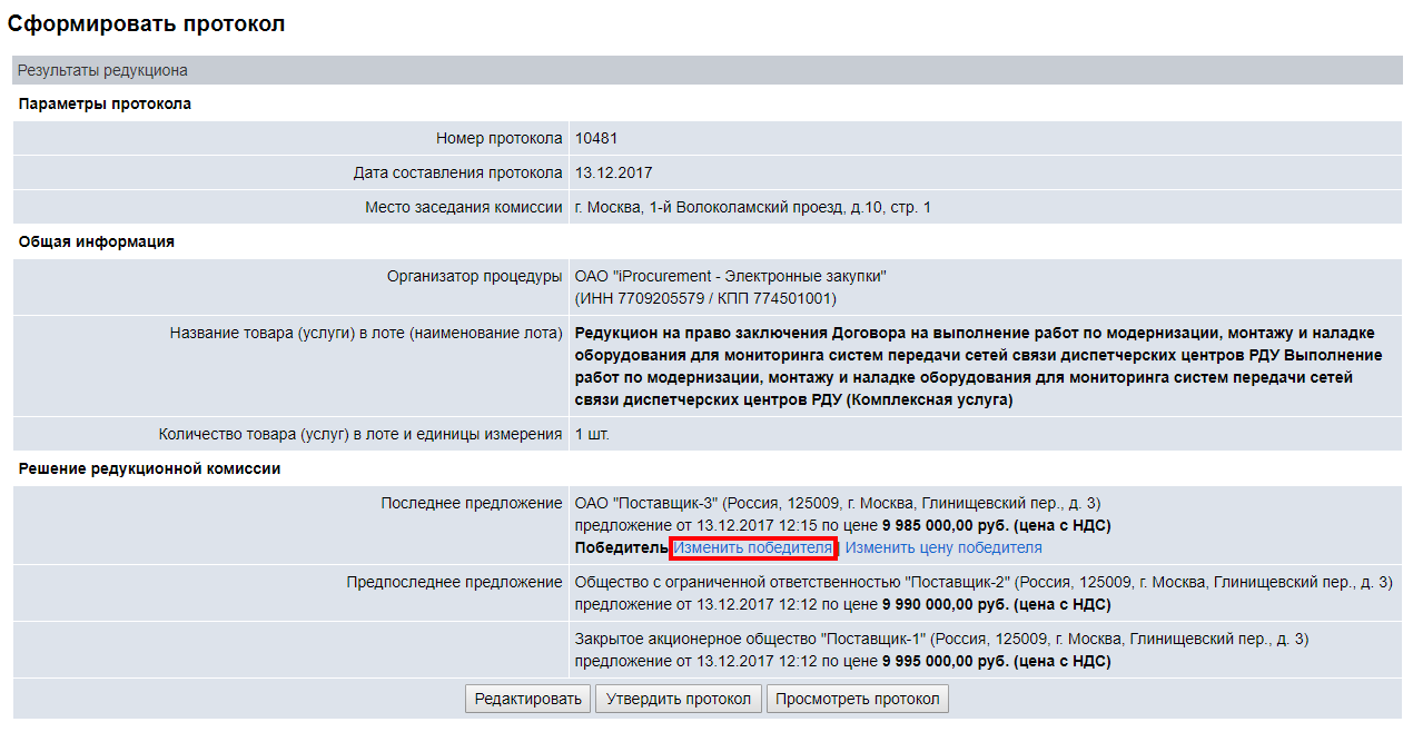8. Чтобы официально завершить процедуру и направить участникам протокол заседания рудукционной комиссии, нажмите кнопку
