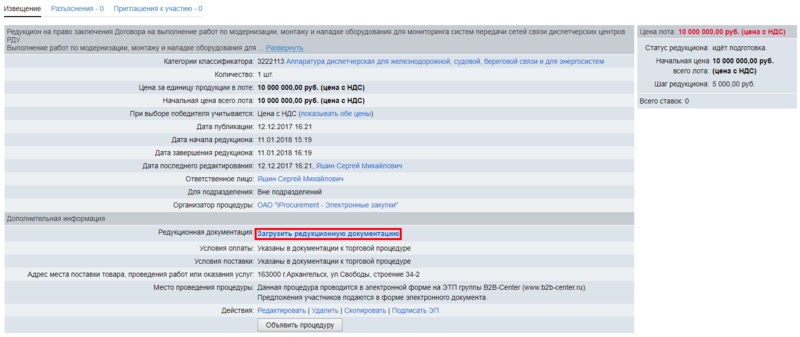 4. Для внесения изменений в опубликованный редукцион нажмите ссылку Редактировать. Внесите необходимые изменения, нажмите кнопку