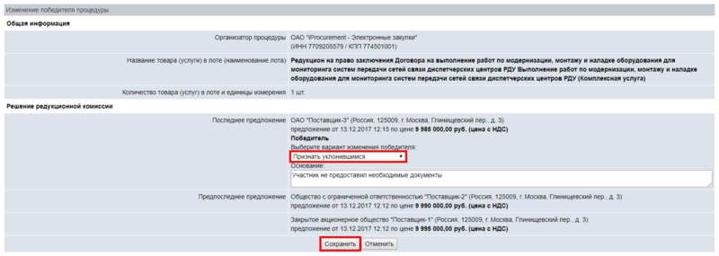 Появится уведомление Изменения успешно сохранены. В строке Последнее предложение отобразится статус Уклонившийся и ссылка Отменить. В строке Предпоследнее предложение отобразится статус Победитель и ссылка Изменить победителя.