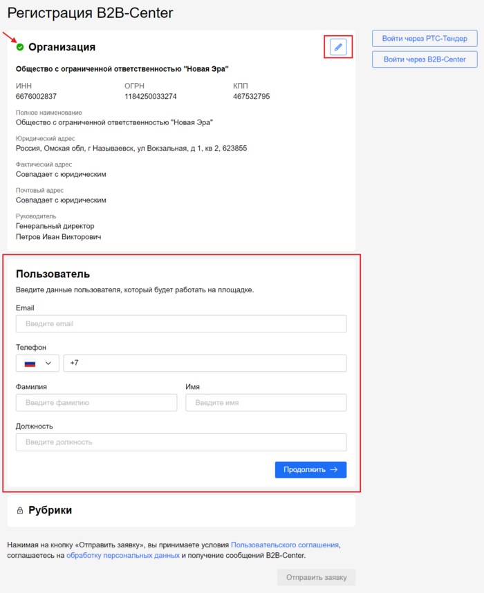 Блок Пользователь отобразится с отметкой Галочка зеленая 2025-07-28-5294.png, для его редактирования можно использовать кнопку с изображением карандаша. Блок Рубрики станет доступен для заполнения.