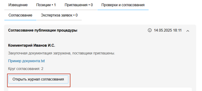 2. При переходе в процедуру страница Извещение содержит дополнительный блок с возможностью переключения между этапами процедуры. По умолчанию выбран текущий этап, для которого требуется согласование.