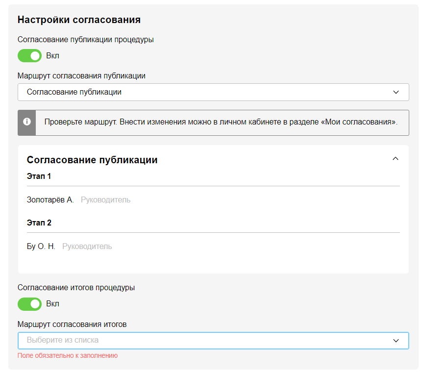 Для согласования публикации процедуры и итогов процедуры ответственному за проведение процедуры пользователю необходимо перед запуском согласования выбрать маршрут согласования.