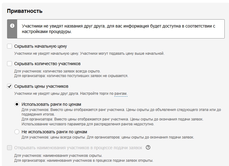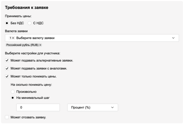 - Может только понижать цены (если данная настройка активна, участник не сможет увеличить цены при редактировании заявки на этапе подачи заявок):