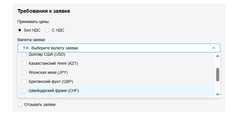 На этапе создания процедуры вы можете отметить в выпадающем списке валюты, которые участники смогут выбрать при подаче заявки. Если участник укажет цену позиции в другой валюте, Система пересчитает и отобразит цену и стоимость заявки в валюте процедуры. Ранжирование заявок участников также будет осуществляться по ценам в валюте процедуры.