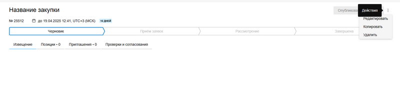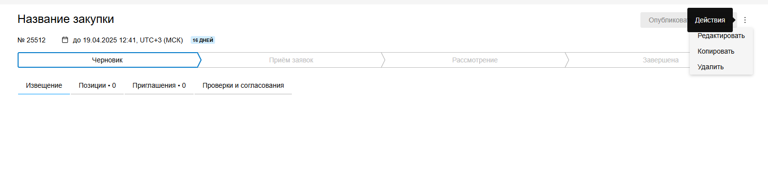 Для редактирования, копирования или удаления черновика извещения используйте соответствующие кнопки в правом верхнем углу страницы.