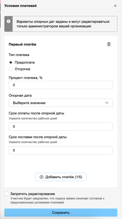 - Чтобы участник не мог вносить изменения в условия платежей и был уведомлен, что подача заявки означает согласие с предложенными условиями платежей, установите отметку в поле Запретить редактирование;
