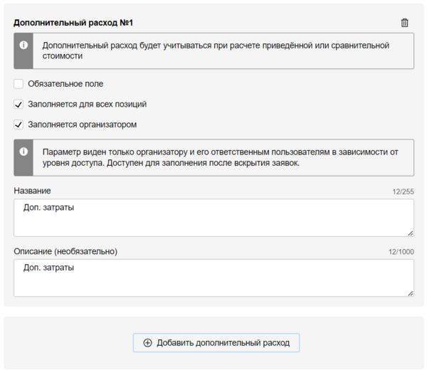 Дополнительный расход, указанный организатором на этапе рассмотрения, учитывается при расчете сравнительной стоимости/приведенной стоимости организатора. Организатор может указать дополнительный расход и для каждой позиции, и для всей заявки участника.