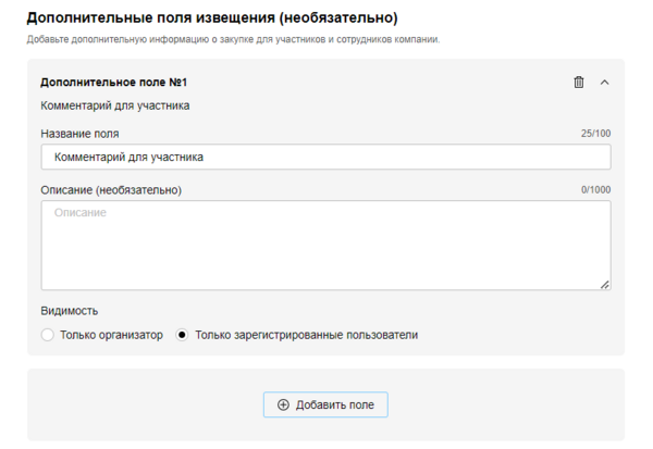 - Только зарегистрированные пользователи — поле будет видно всем внутренним пользователям организации и всем зарегистрированным пользователям платформы B2B.