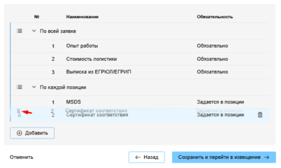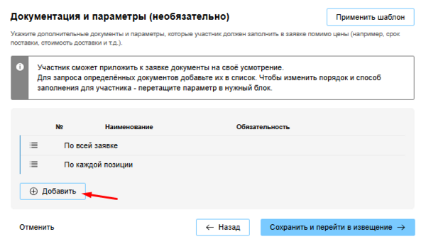 В блоке Документация и параметры (необязательно) можно указать дополнительные требования к заявке участника. Параметры и документы заявки участника могут быть добавлены по всей заявке или по каждой позиции.
