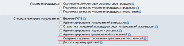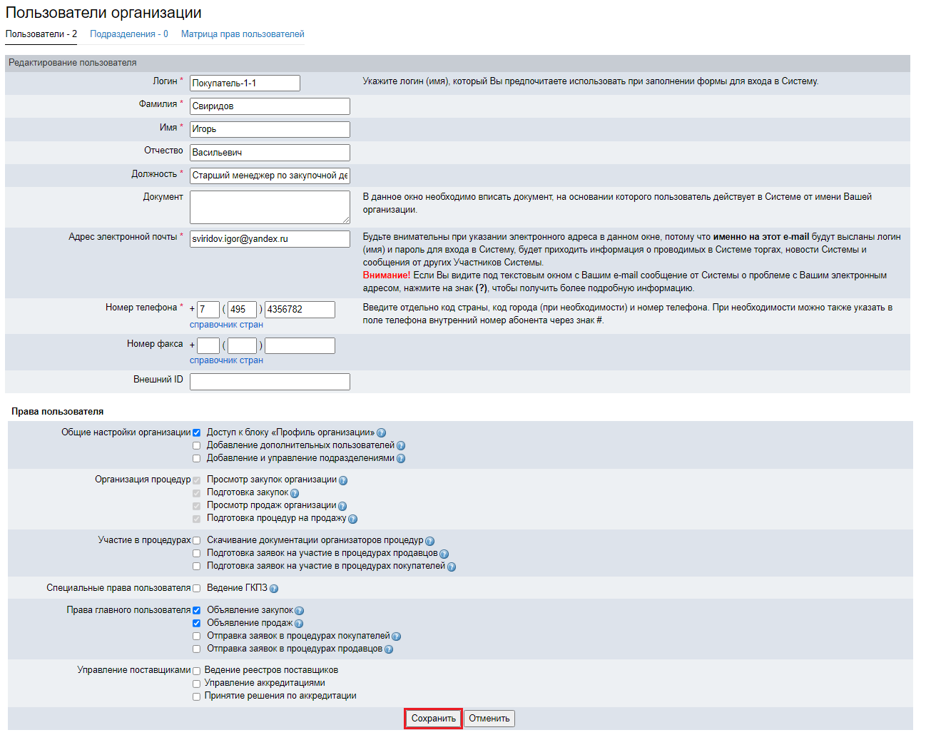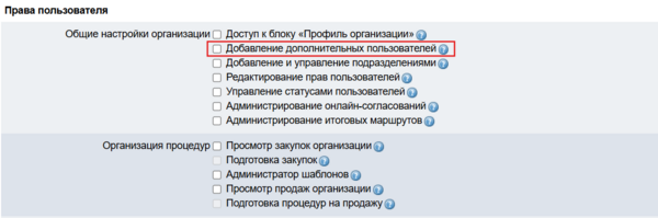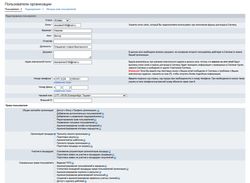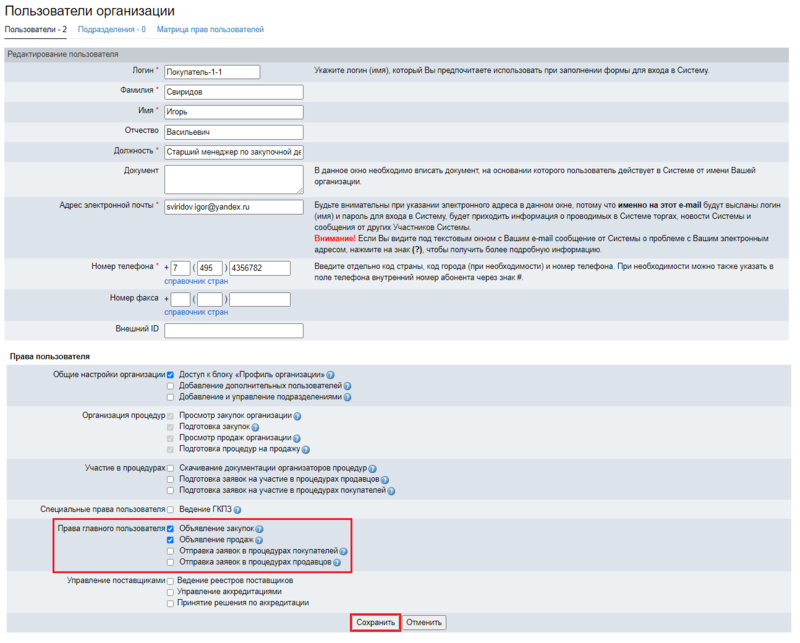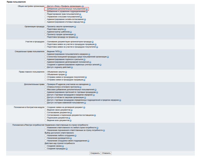 Внимание! У дополнительных пользователей доступ к Системе ограничен, а объявлять торговые процедуры, принимать в них участие и использовать ЭЦП может только главный пользователь. Чтобы подключить дополнительному пользователю Полномочия главного пользователя, установите отметки в соответствующем блоке формы добавления/редактирования пользователя.