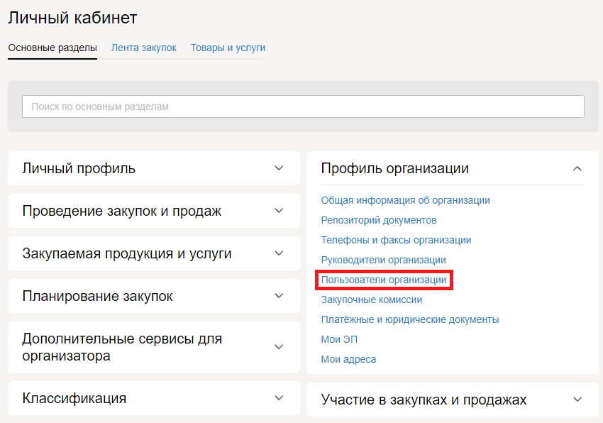 1. Перейдите в Личный Кабинет, раскройте блок Профиль организации и перейдите в раздел Пользователи организации.